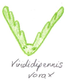 Virididipennis vorax ('with two green feathers and a huge appetite') was a small tree-dwelling reptile related to lizards and snakes but with large scaly outgrowths on the head which resemble feathers. The rest of the body is not known, but it has been suggested that it could be upto several miles long. It dwelled in Pliocene Thailand.